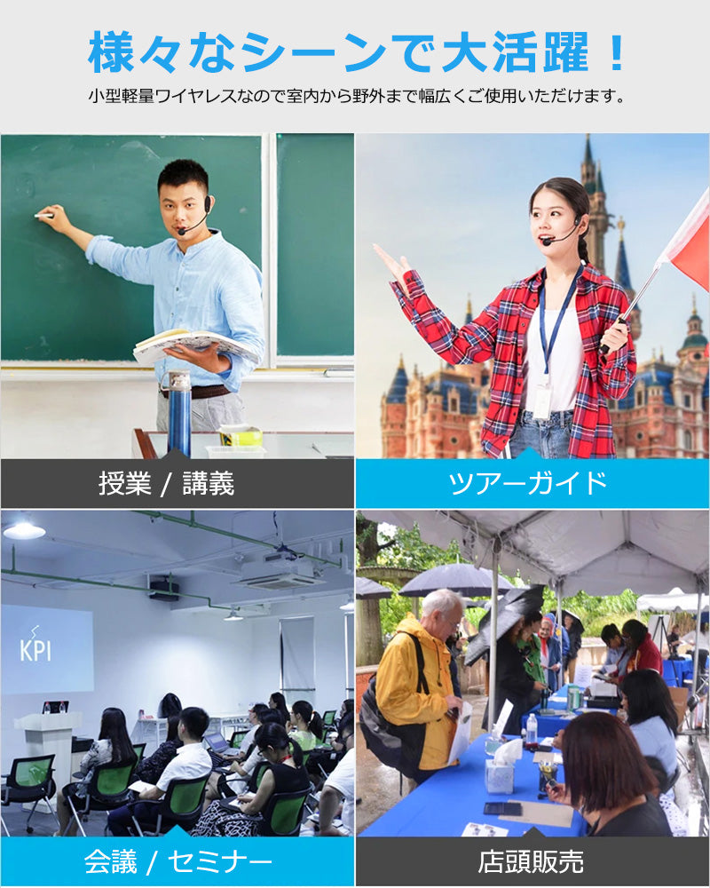 スピーカーや拡声器などと無線で繋がるワイヤレスマイク。送信機と受信機は自動的にペアリングされ、わずらわしい操作が必要なく、すぐに使えるプラグアンドプレイ対応。 USBポートから充電可能で、電池交換不要のエコな設計。ツアーガイド、講義、運動会、ライブ、防災用、店頭販売、スポーツインストラクター等で大活躍!バッテリー内蔵の充電式なのでアウトドアにも最適です。