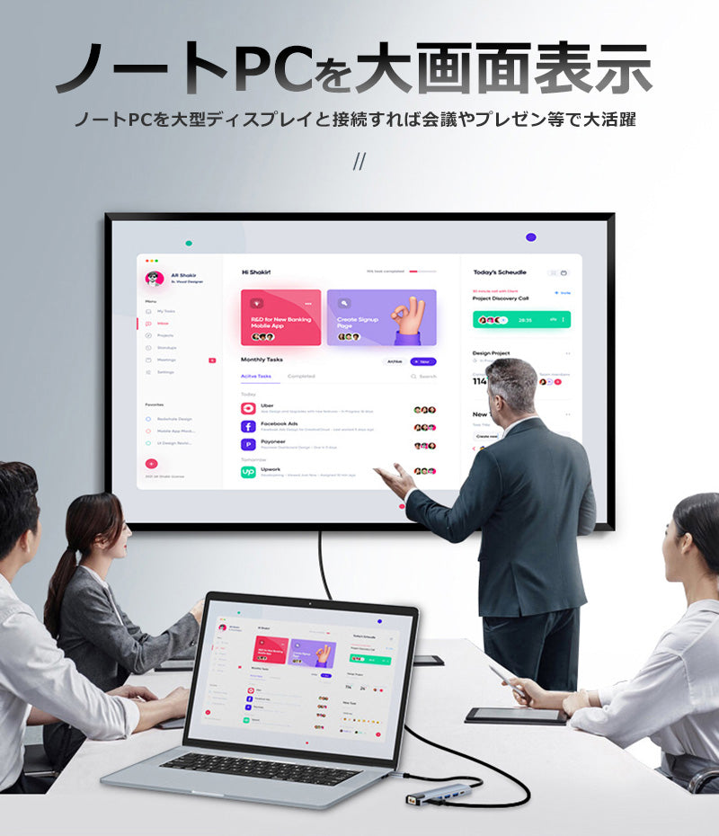 本製品は多機能な6in1 USB Type-C バスパワードッキングステーションで、4K HDMI出力ポート×1、100WPD充電ポート×1、USB 3.0ポート×3、RJ45LANポート×1を搭載しているので、PCのポート不足を解消し、作業効率UPに役立ちます。プラグアンドプレイ対応なので、挿すだけで簡単にすぐ使えます。